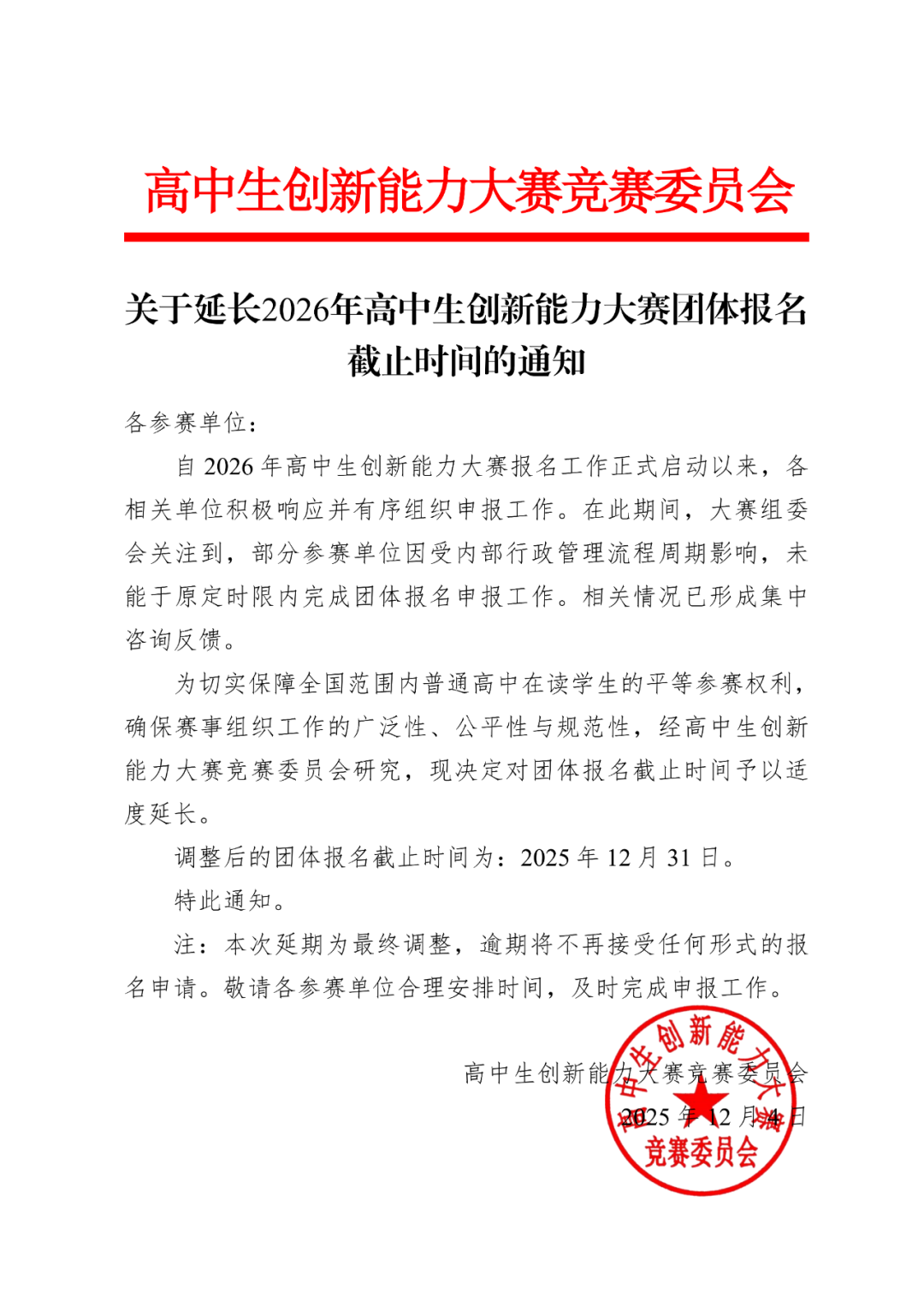 关于延长2026年高中生创新能力大赛团体报名截止时间的通知
